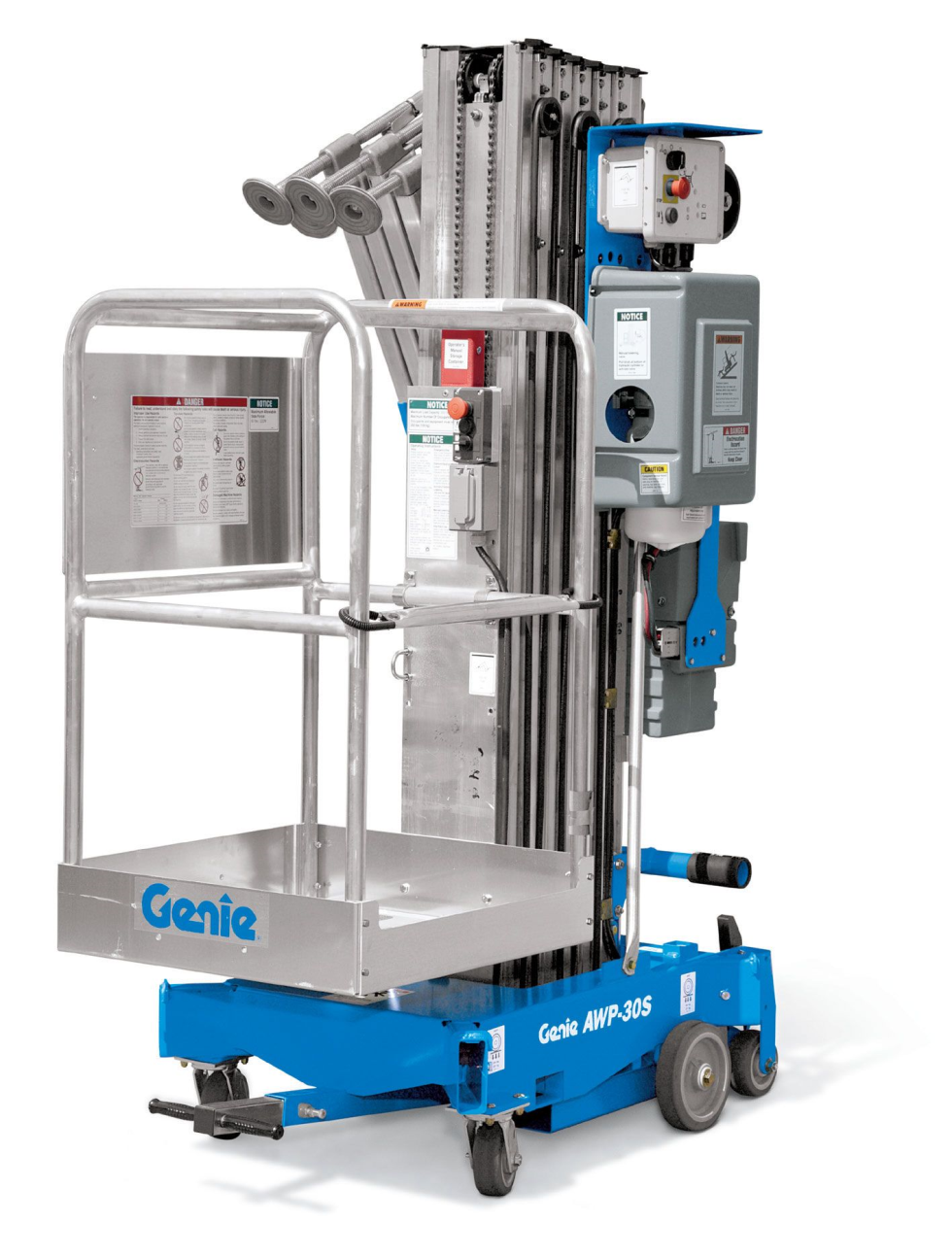 Genie AWP-30S Super Series aerial work platforms are an industry favorite due to their ease of use, convenience and flexibility. Quick, one-person setup and simple operation — ideal for use in rental, light-duty construction and maintenance applications.