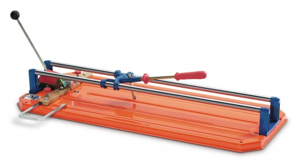 Manual scratch cutter uses a carbide cutting wheel similar to that used on a glass cutter to score the surface of the tile. It then snaps the tile on that line using a lever-operated breaker.